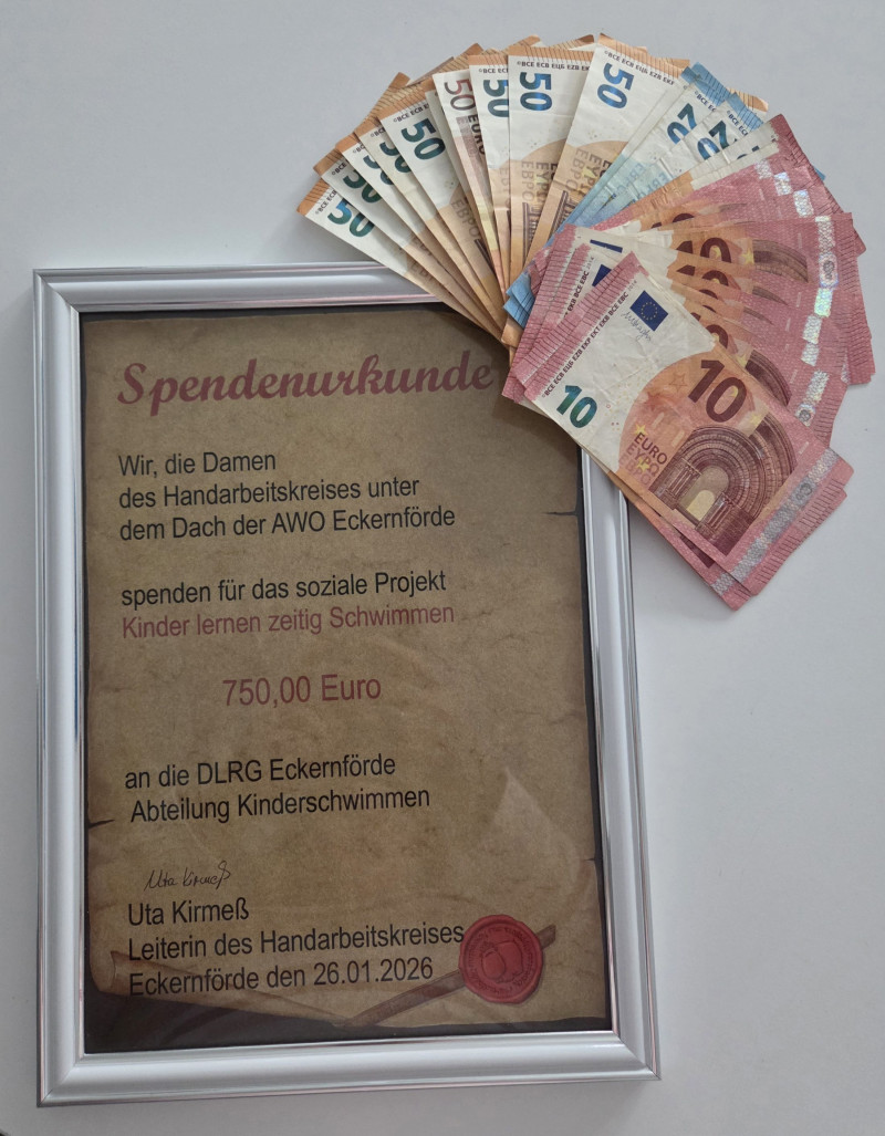750 Euro haben wir für die Kinderschwimmausbildung von den fleißigen Damen des Handarbeitkreises aus Eckernförde erhalten.